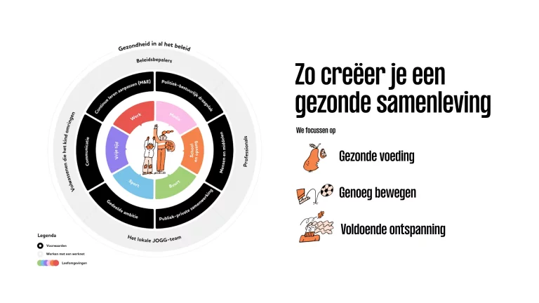 Het model biedt richting, maar laat ruimte voor lokale invulling. Het lokale JOGG-team speelt een sleutelrol: ze bouwen sterke werknetten over alle domeinen heen die gericht zijn op doén.