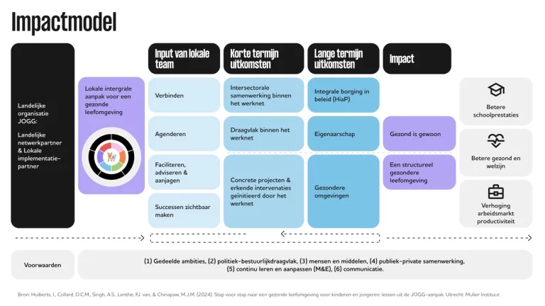 De JOGG-aanpak werkt met één overkoepelend impact model. Dit model maakt zichtbaar hoe je als gemeente stap voor stap werkt aan duurzame verandering: van samenwerking organiseren tot het borgen van gezondheid in beleid.