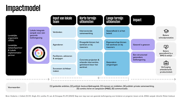 Het impactmodel vormt de basis van de JOGG-aanpak en bestaat uit verschillende onderdelen. Samen geven deze richting om in jouw gemeente structureel aan gezondheid te werken. Hieronder vind je de belangrijkste onderdelen van dit model.
