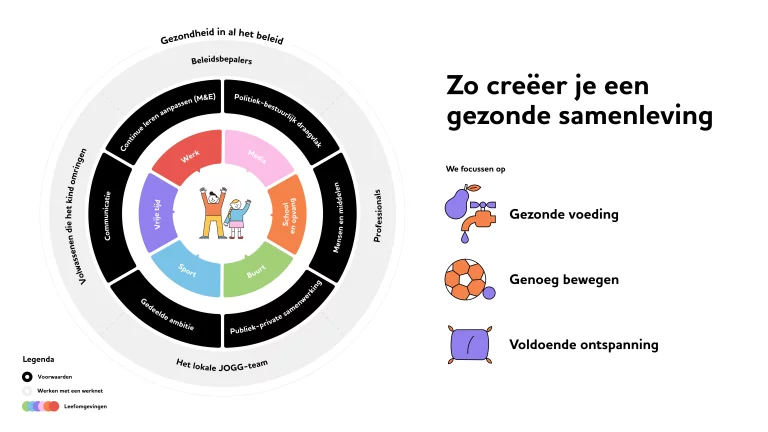 De JOGG-aanpak verbindt sectoren en partners om gezamenlijk te bouwen aan een gezonde leefomgeving. Gemeenten werken met onderwijs, sport, welzijn, zorg, bedrijfsleven en inwoners in een Werknet: op basis van gedeeld eigenaarschap en vertrouwen, en door optimaal te benutten wat er al bestaat.